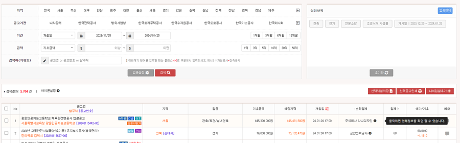 1. 입찰정보에서 업종설정을 했다면, 입찰정보에서 설정한 업종과 동일하게 낙찰정보에서 적용이 됩니다.