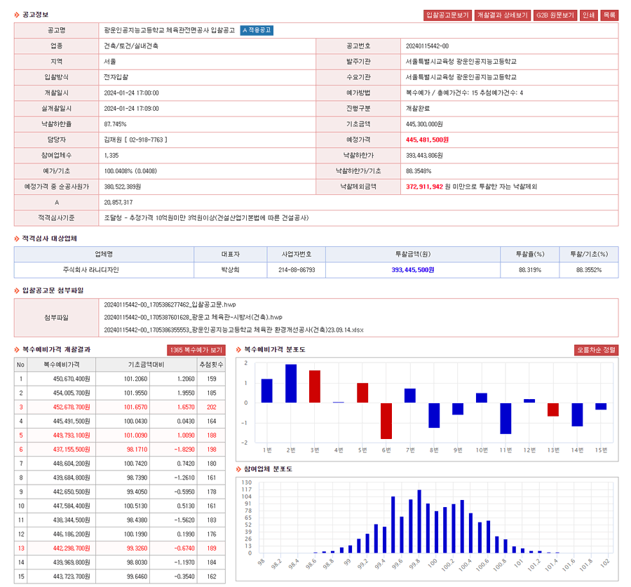 2. 입찰 상세정보에서는 각종 정보 및 복수예비가격 분포도와 참여업체들의 사정율별 분포도를 한눈에 파악할 수 있습니다.