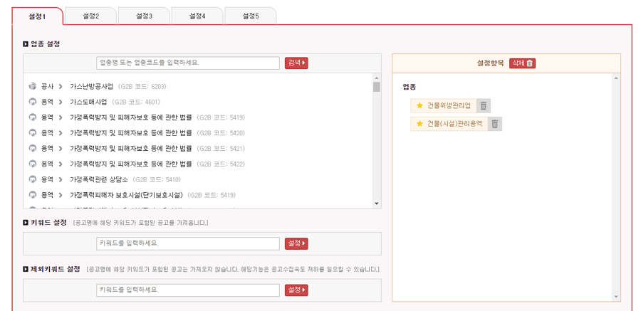 키워드 설정에서는 원하는 키워드를 설정하면 해당 키워드가 공고명에 포함된 공고를 가져옵니다.