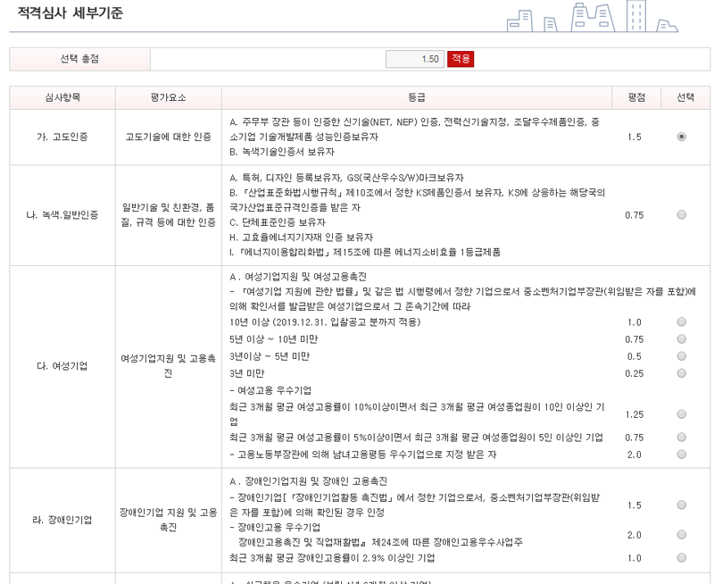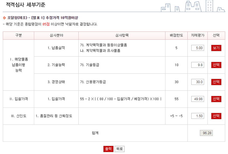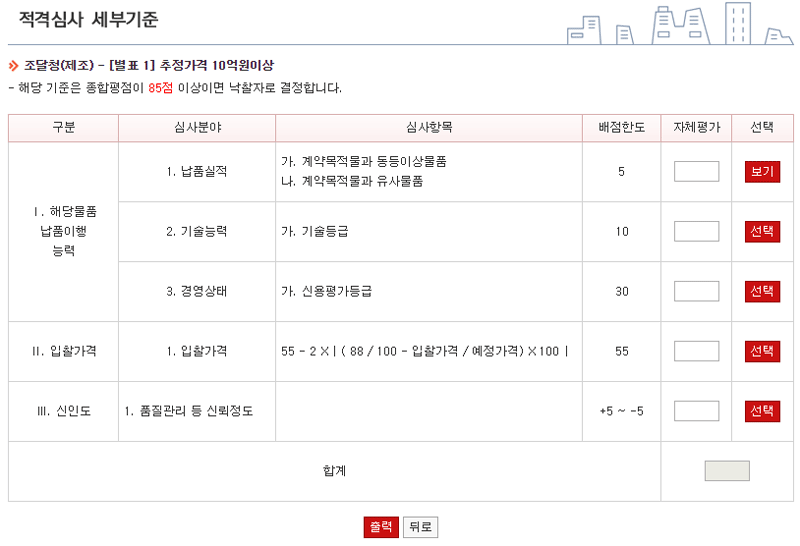 1. 적격심사계산기라고 적혀있는 빨간색 버튼을 클릭하면 아래와 같은 적격심사 세부기준이 보여집니다.