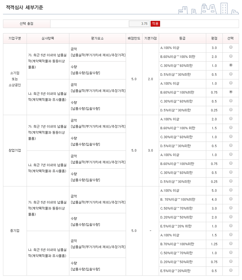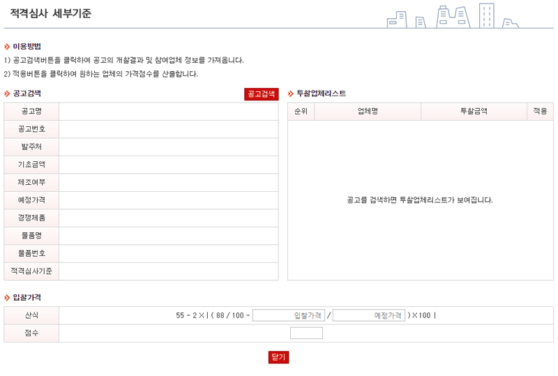 입찰가격점수란에 있는 선택버튼을 클릭하면 아래와 같이 보여집니다.