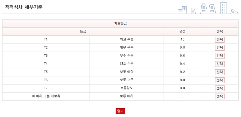기술등급평가를 위해 선택버튼을 누르면 아래와 같은 창이 보여지게 됩니다.