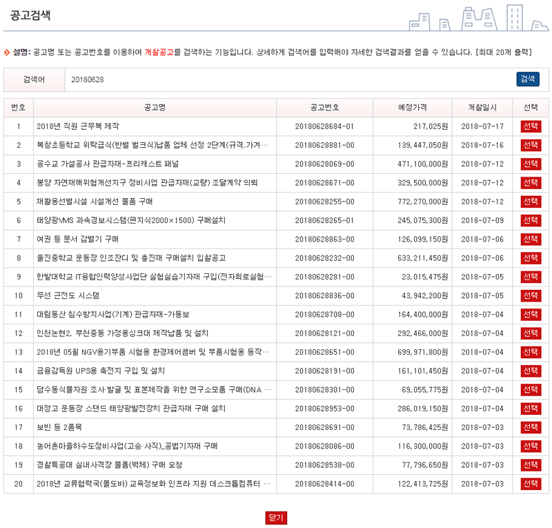 공고검색 버튼을 클릭하면 다음과 같은 화면이 보여집니다.