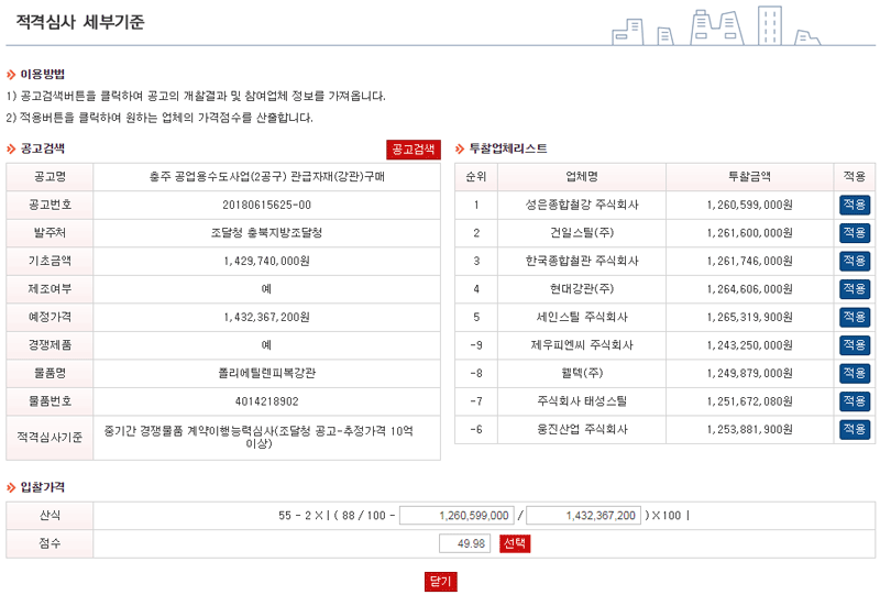 업체별로 적용버튼을 누르면 해당 업체의 투찰결과를 바탕으로 입찰가격점수가 산출됩니다.