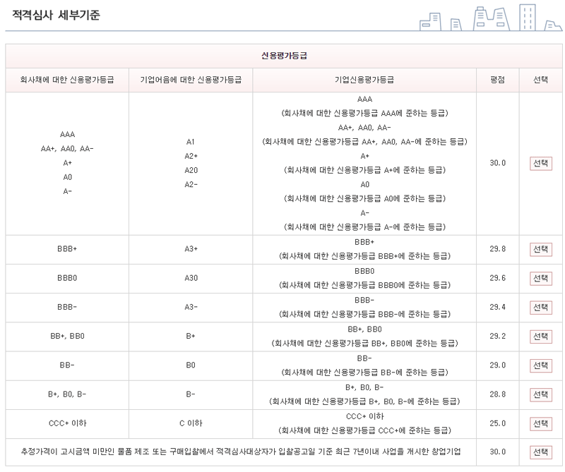 신용평가등급 위해 선택버튼을 누르면 아래와 같은 창이 보여지게 됩니다.