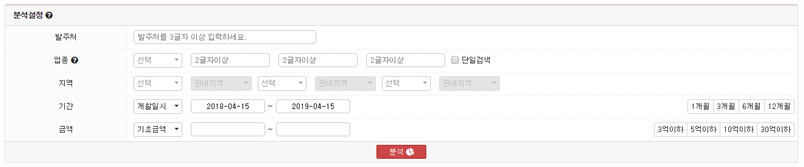 분석설정에서 여러 설정이 가능합니다. 해당 항목 중 발주처 및 기간은 필수 항목입니다.