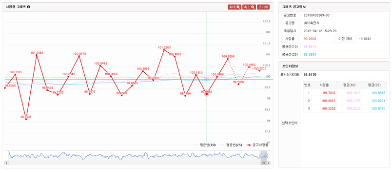 그래프에 마우스를 올려놓으면 ┼(십자가)모양의 선이 보여지며, 마우스 커서가 있는 부분의 정보는 오른쪽 그래프 공고정보에서 확인할 수 있습니다.