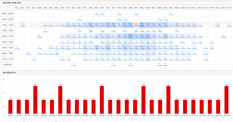 사정율 분포도는 전체적인 사정율 분포도를 확인할 수 있으며, 2번의 클릭이 가능합니다. 1번 클릭을하면 해당 사정율의 둘째 자리 사정율 분포도가 보여집니다.