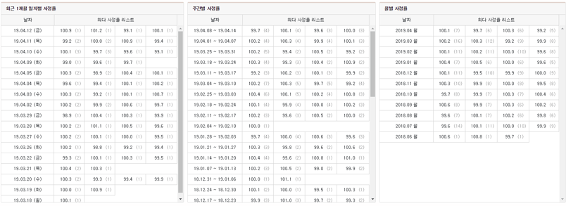그 다음, 해당 검색 기간의 주간별 최다 빈도 사정율 4개를 보여줍니다.