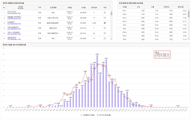 공고의 사정율 빈도는 비율로 표시가 되며, 라인(선)그래프로 표시가 됩니다. 업체들의 분포는 비율로 표시가 되며, 바(막대)그래프로 표시가 됩니다.