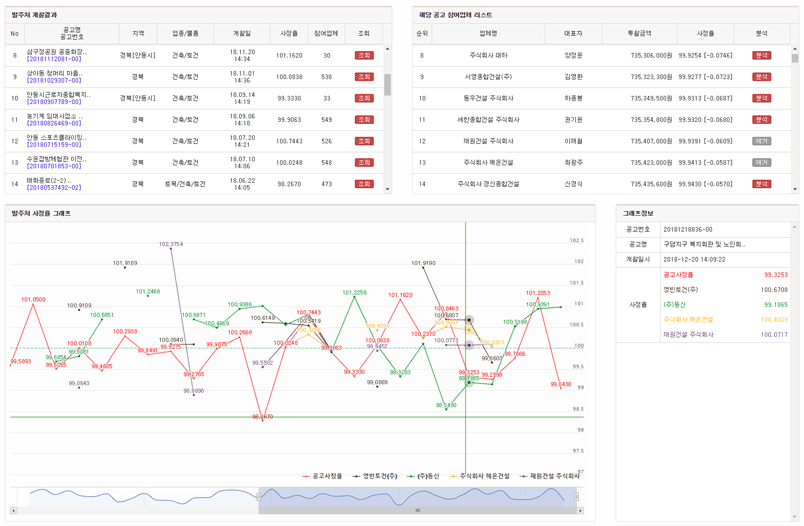 그래프에 마우스를 올려놓으면, 공고사정율 및 분석설정한 업체들의 사정율을 확인할 수 있습니다.